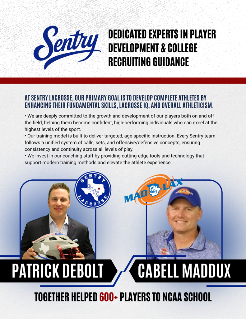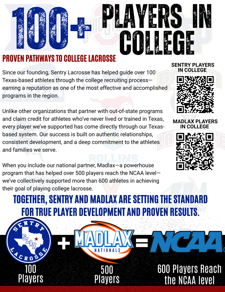 Over the past 15 years, Sentry Lacrosse has helped send more than 100 Texas players to NCAA college lacrosse programs. That’s a milestone we’re incredibly proud of—not just because it’s difficult to achieve in a non-traditional lacrosse market like Texas, but because it reflects the relentless work ethic, dedication, and development of our players and families.